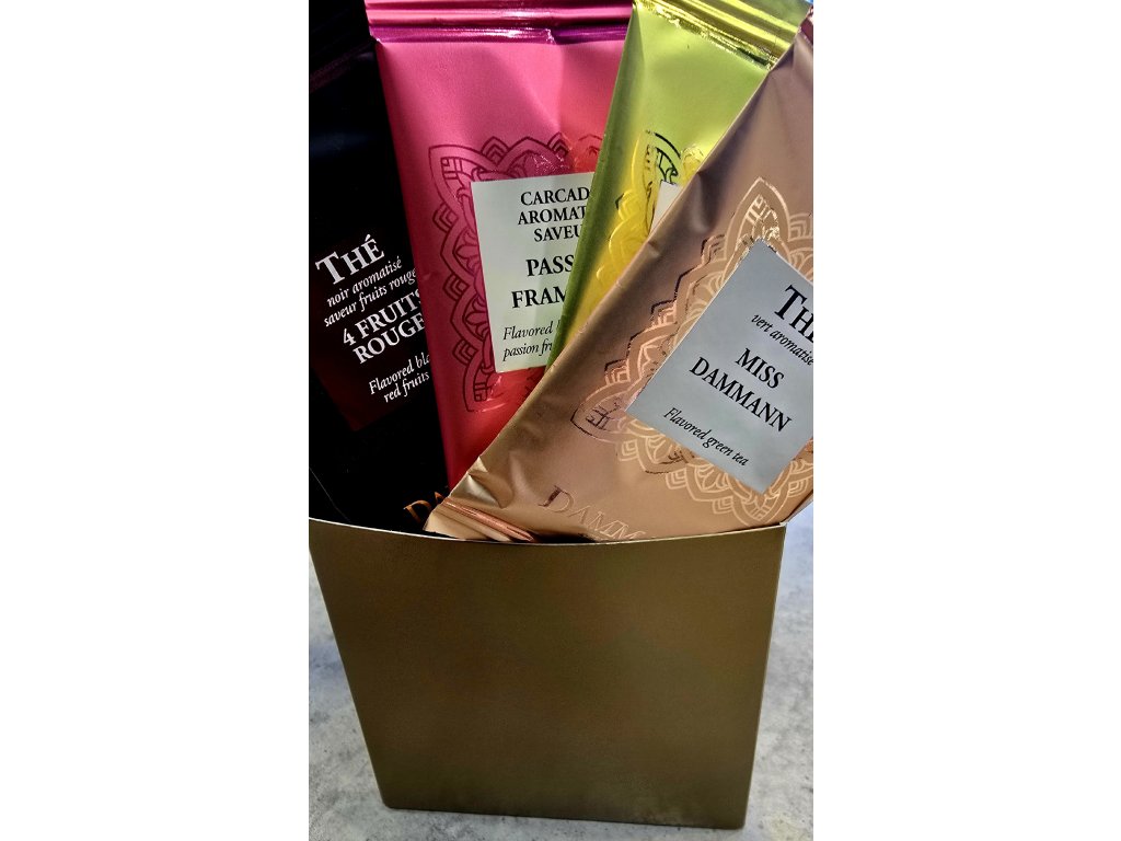 Limitovaná edice s výběrem 20 druhů čajů, rooibosu a bylinkových směsí Dammann Fréres ve zlaté dárkové krabičce.